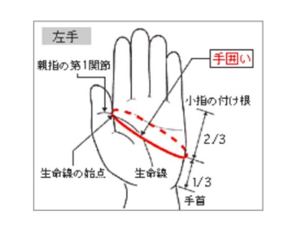 手囲いとは、親指の第一関節とほぼ同位置にある生命線の始点と、小指の付け根と手首を結んだ線の、手首から3分の1の距離を結んだ手の平の周りの長さです。