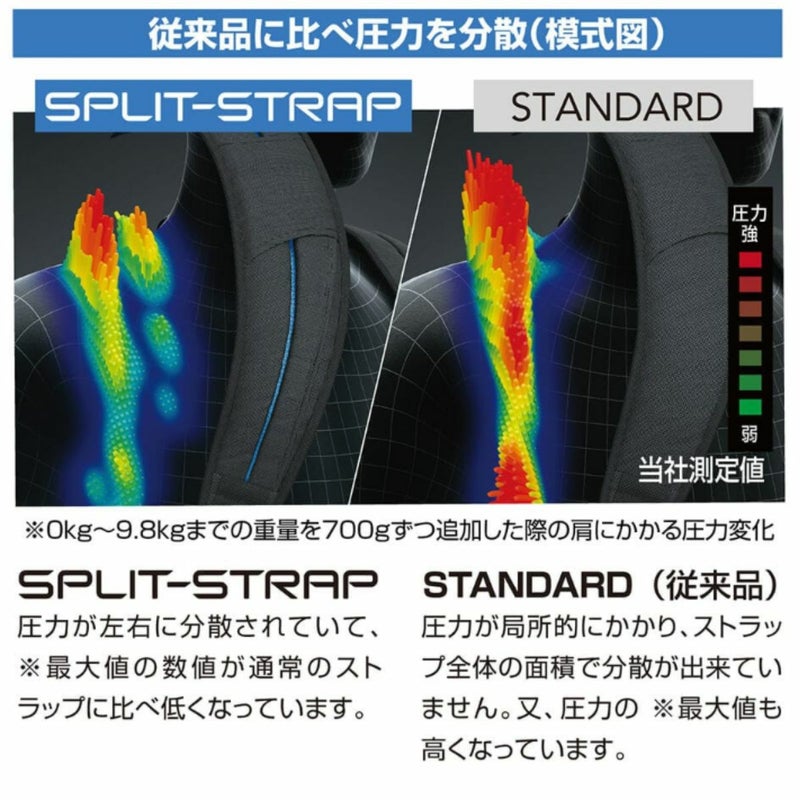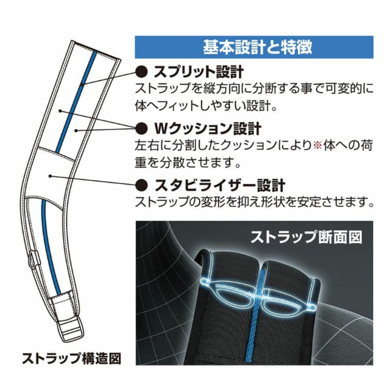 肩ストラップのクッションを左右に分割し、体への荷重を分散。肩の複雑な動きにフィットさせやすい設定。