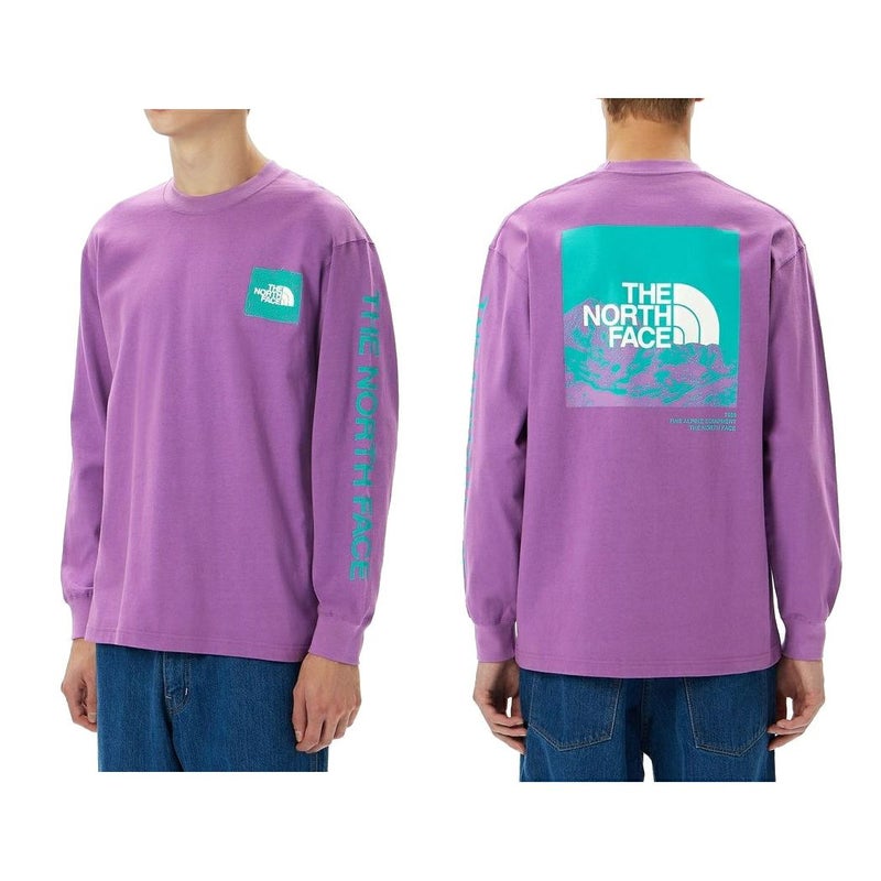 雄大なヨセミテの山脈のグラフィックを組み合わせた大きなスクエアロゴを背面に、THE NORTH FACEの文字を左袖に配置した、スポーティなデザインです。