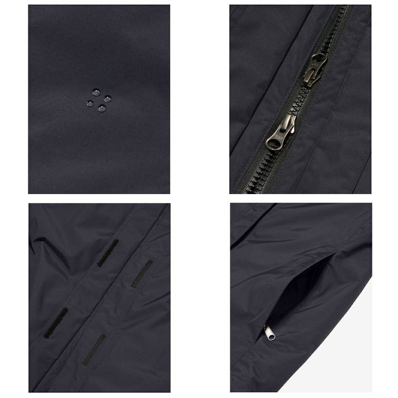 インナージャケットとアウターはフロント内部のファスナー袖口と首元のスナップボタンで連結して着用することも、それぞれを単体で使用することもできます。