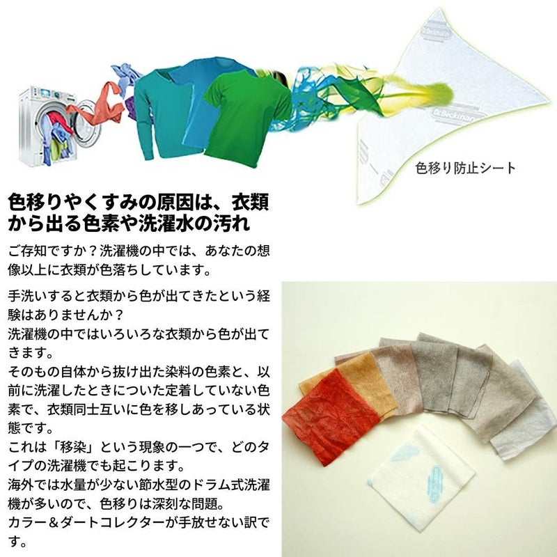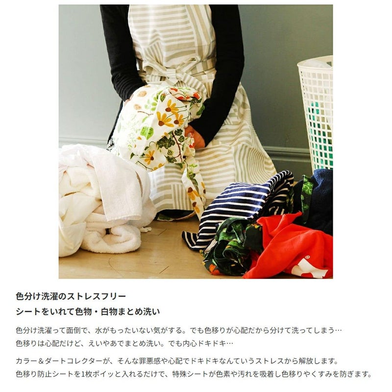 色移り防止シートを1枚ポイッと入れるだけで、特殊シートが色素や汚れを吸着し色移りやくすみを防ぎます。