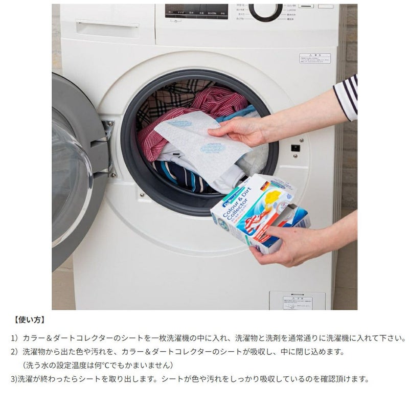 1)カラー&ダートコレクターのシートを一枚洗濯機の中に入れ、洗濯物と洗剤を通常通りに洗濯機に入れて下さい。