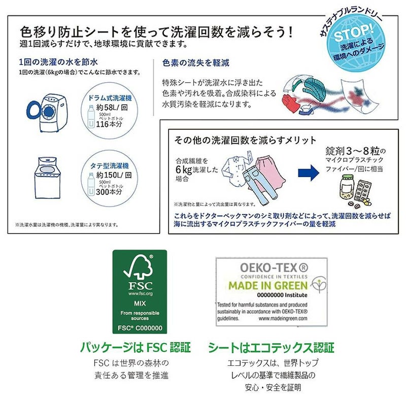 特殊シートが衣類から出る色素や汚れを吸着し、色移りを防ぐカラー&ダートコレクターが、より環境配慮型に進化。