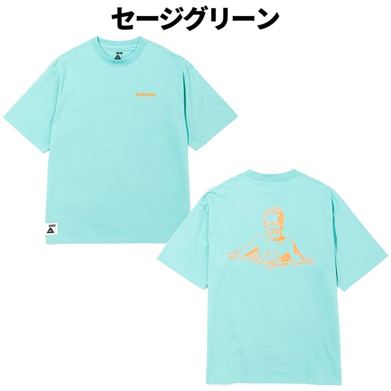 背面に謎のおじさんが描かれたユニークなデザイン。フロントには”BORING=退屈”の文字が刺繍で落とし込まれているのが洒落が効いてて面白い。ボディは8.1ozのヘビーウエイトで使い勝手の良いリラックスフィット。