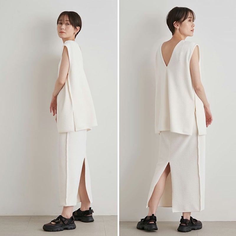 バックシルエットは深めのスリットでヘルシーな雰囲気をプラスしてくれます。