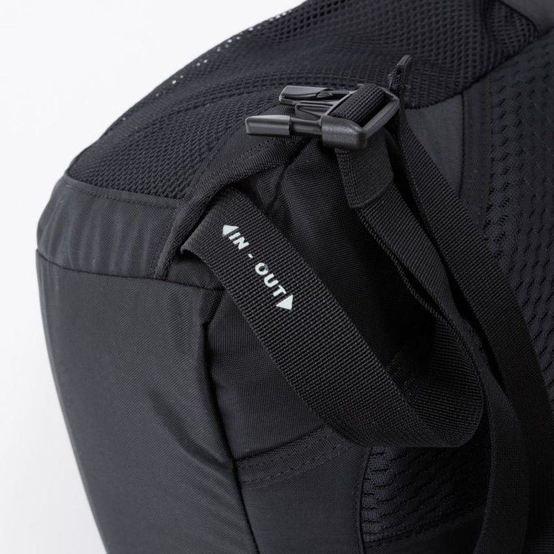 サイドのコンプレッションベルトとサイドポケットを組み合わせると、トレッキングポールの持ち歩きにも活躍。