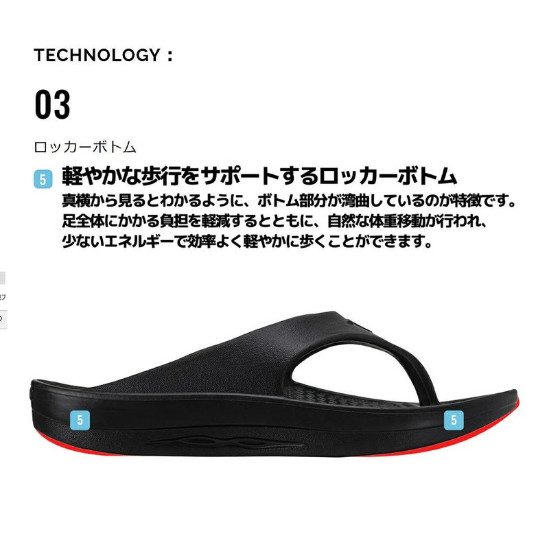ロッカーボトムにより前方への自然な体重移動がおこなわれ、少ないエネルギーで効率よく軽やかに歩くサポートをします。 ※ロッカーボトム サンダル底の前部と後部がロッキングチェアのようにカーブしている。