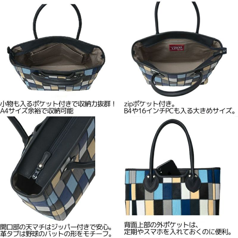 カジュアル バッグ トライオン TRION PANELシリーズ トートバック メンズ レディース ユニセックス 縦型 マルチ ブルー 野球 カジュアル グラブレザー 革 本革 バッグ 手掲げバッグ 通勤 通学 PC収納可能 パッチワーク DPC250M