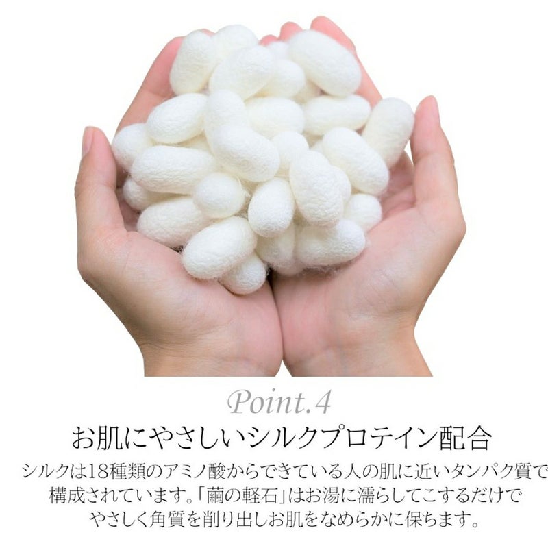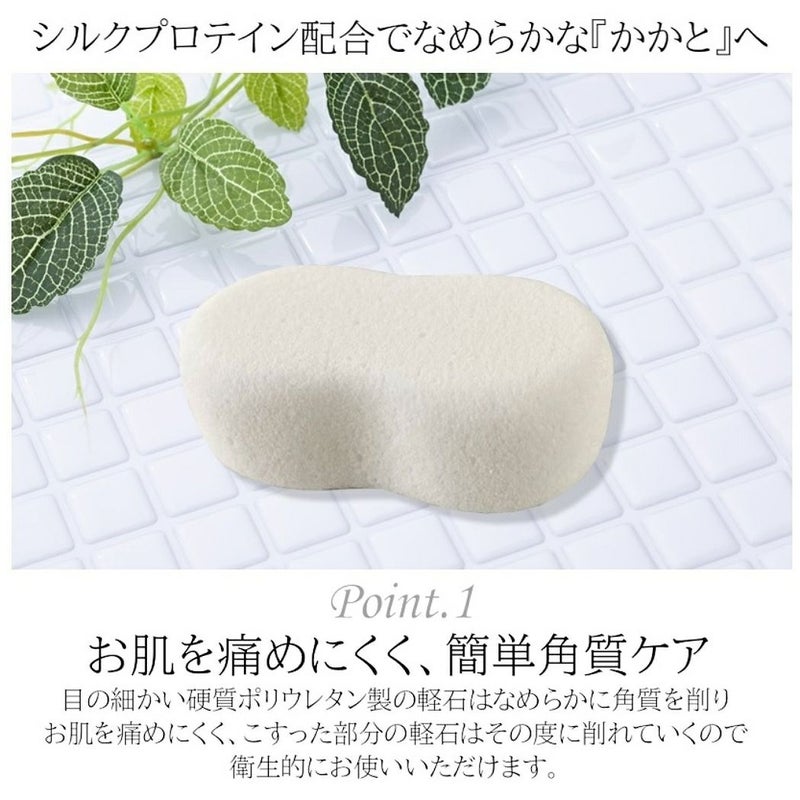 シルクプロテインの微粉末を配合した硬質ポリウレタンのお肌に優しい軽石です。絹の成分がお肌になじむので、皮膚を荒らさず、角質をやさしく落とします。足の裏やかかと、ひじなど気になる硬皮質部分にお使いください。かさつく素足がツルツルになります。