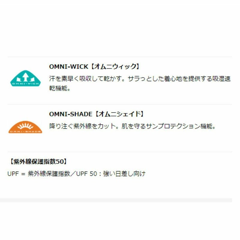 吸湿速乾機能「オムニウィック」を備えているため、汗ばむ季節でもドライな着心地をキープし、サンプロテクション機能「オムニシェイド」が、強い日差しから肌を守ります。