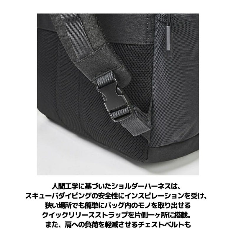 ・人間工学に基づいたショルダーハーネスは、スキューバダイビングの安全性にインスピレーションを受け、狭い場所でも簡単にバッグ内のモノを取り出せるクイックリリースストラップを片側一ヶ所に搭載。また、肩への負荷を軽減させるチェストベルトも