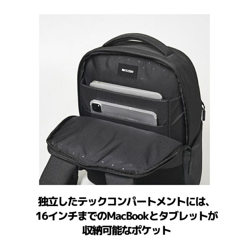 ・独立したテックコンパートメントには、16インチまでのMacBookとタブレットが収納可能なポケット