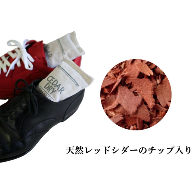 天然のアメリカ杉のチップを使用した除湿乾燥剤。靴の内部を清潔に保ち、さわやかにします。