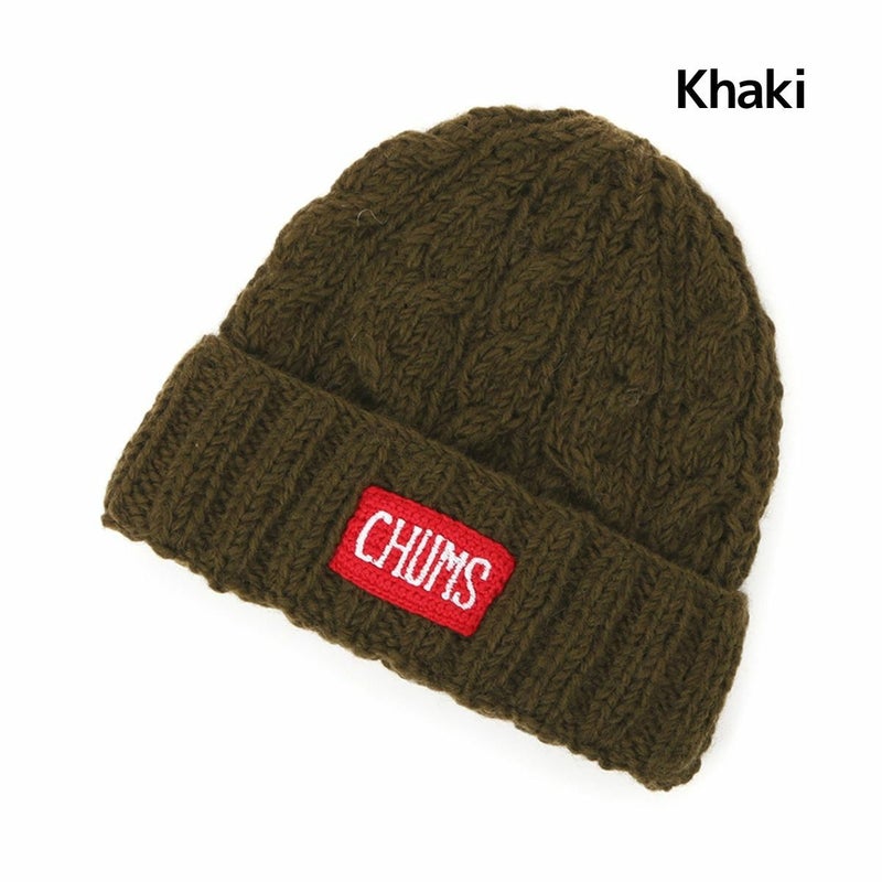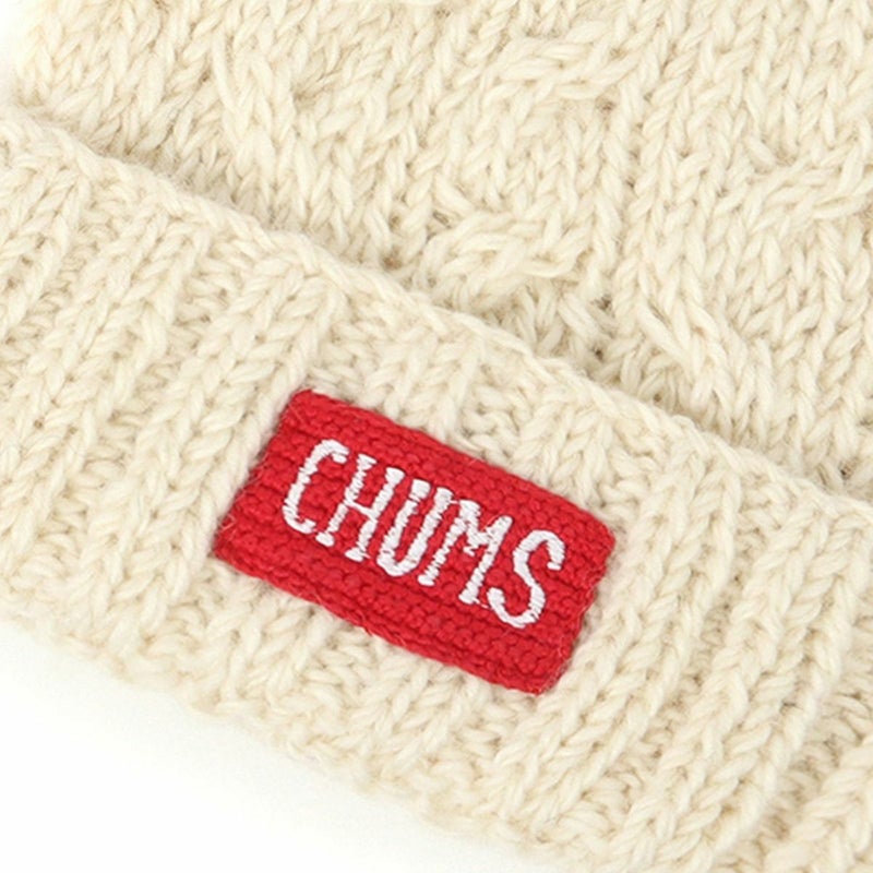 「フロントに編み込んだCHUMSロゴがアクセント、温もりある表情のケーブル編みのニット帽」