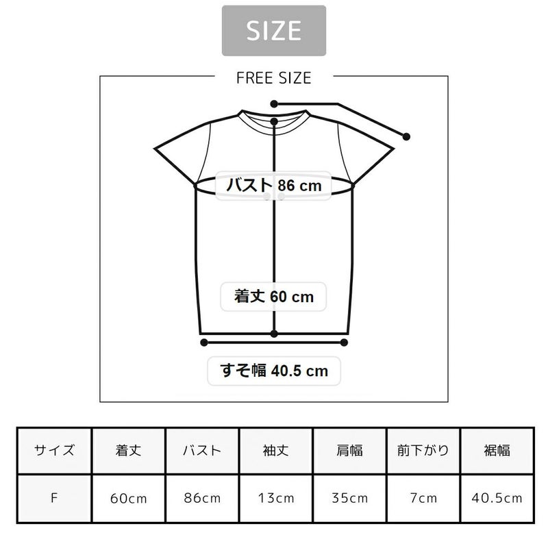 F/着丈:約60cm バスト:約86cm 袖丈:約13cm 肩幅:約35cm 前下がり:約7cm 裾幅:約40.5cm