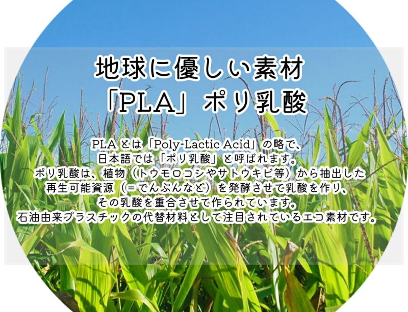 PLA とは「Poly-Lactic Acid」の略で、日本語では「ポリ乳酸」と呼ばれます。ポリ乳酸の原料は石油ではありません。植物由来の素材である甜菜(てんさい)、トウモロコシ、サトウキビなどのでんぷんを原料とするバイオポリマーの一種で、カーボンニュートラル(※) なエコ素材として注目を集めています。