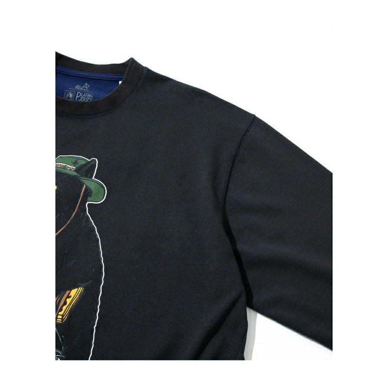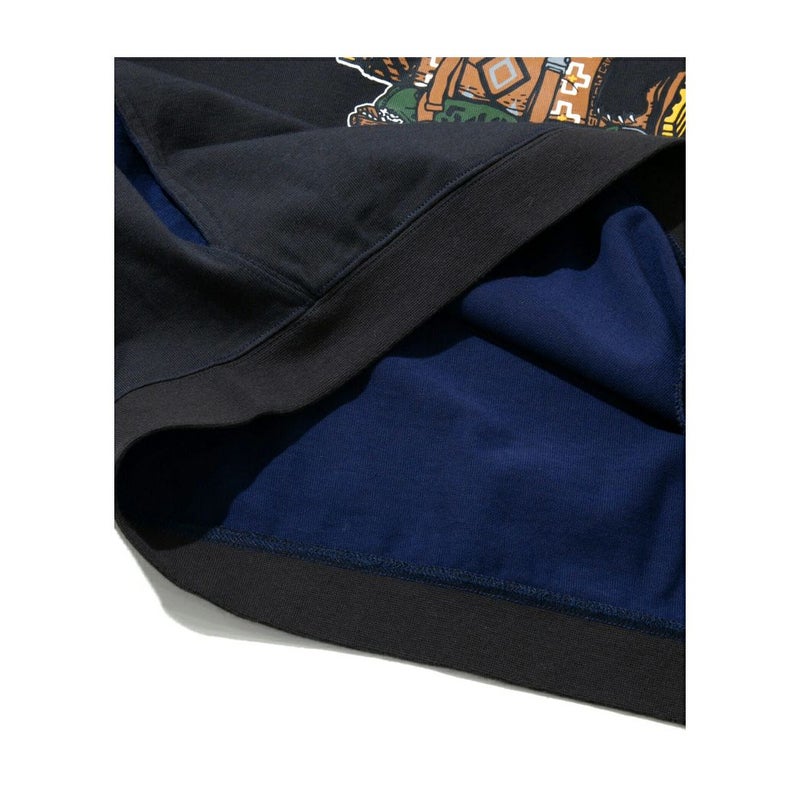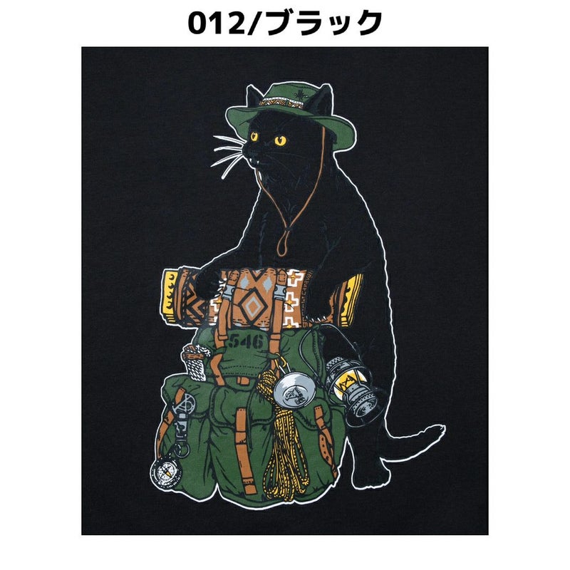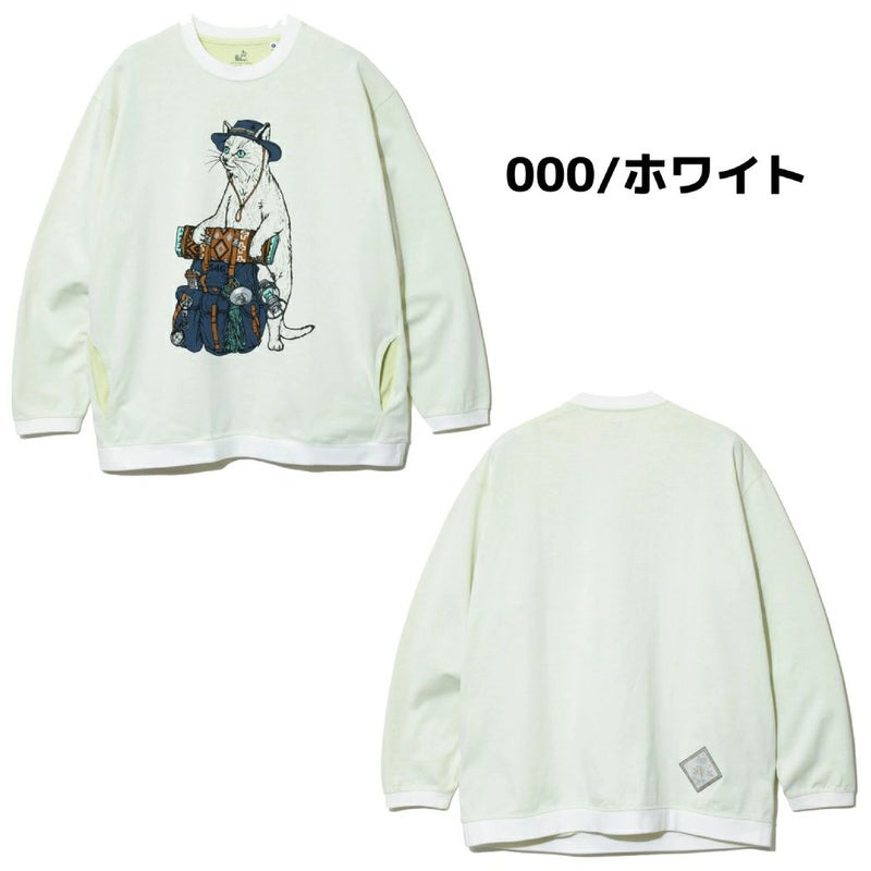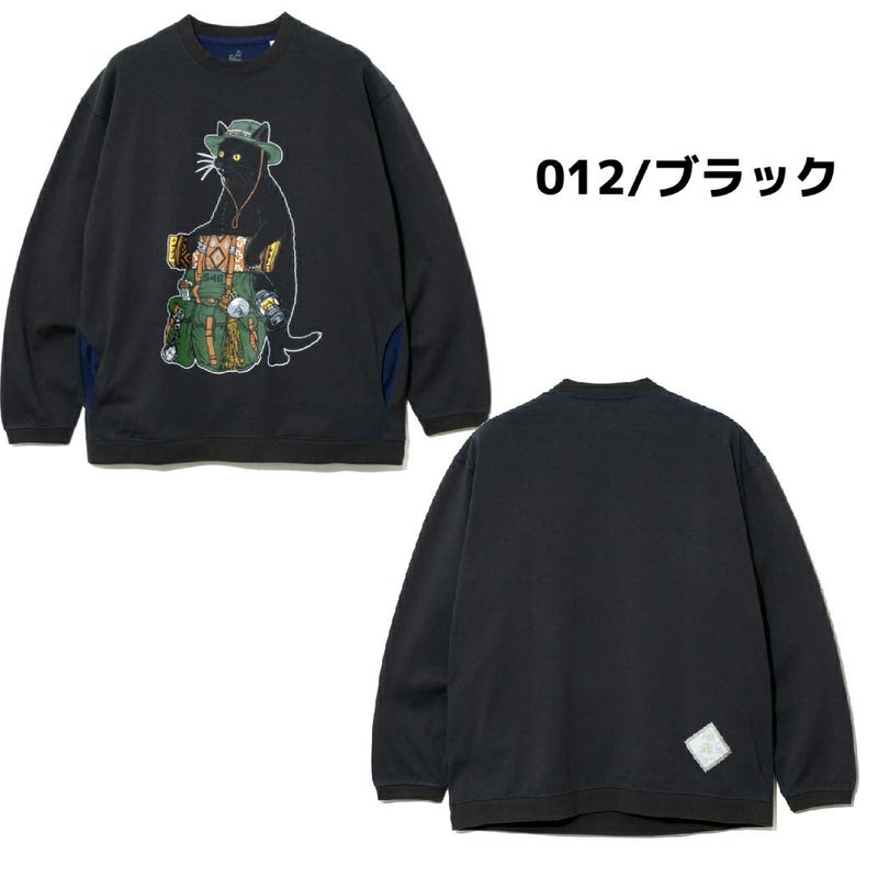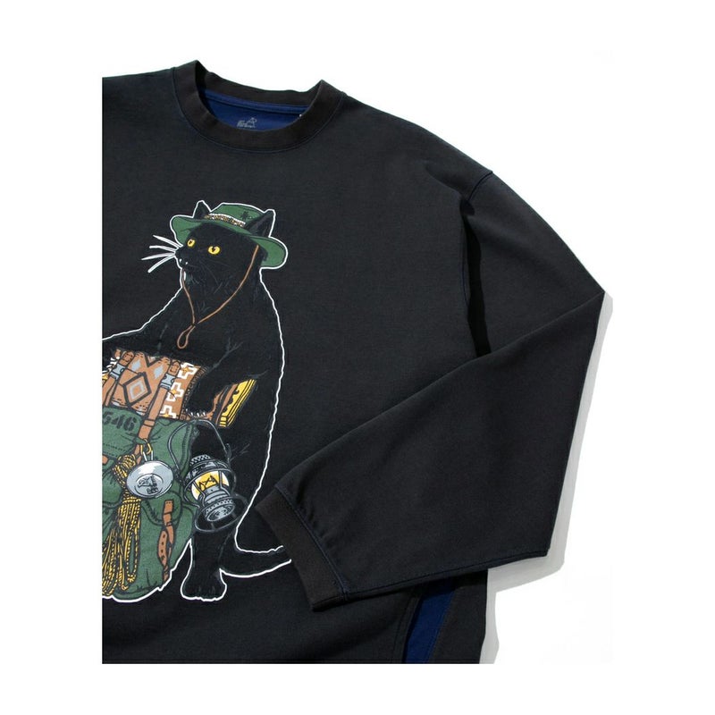 前面に大きなバックパックを持った野営猫をプリント。首、袖と裾にもリブが付き生地の厚みもありスウェット感覚で着用できるロンT です。配色の内袋がチラ見えするサイドポケット付き。