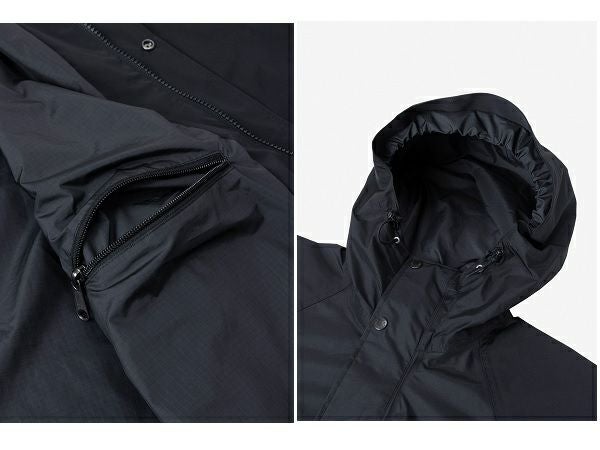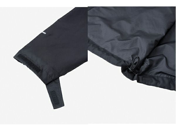 袖口は面ファスナー仕様で、裾はアジャスターでフィット感の調節が可能です。コンパクトに収納でき、携行に便利なスタッフサック付き。