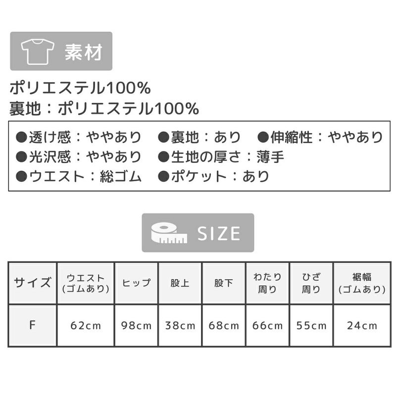 F/ウエスト(ゴムあり):約62cm ヒップ:約98cm 股上:約38cm 股下:約68cm わたり周り:約66cm ひざ周り:約55cm 裾幅(ゴムあり):約24cm