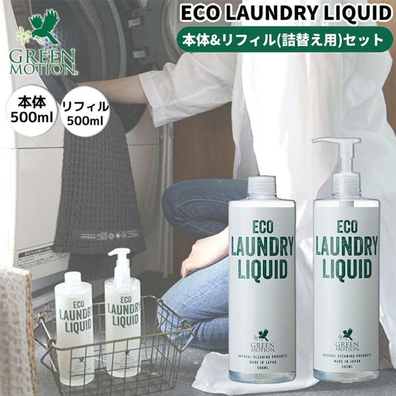 5. グリーンモーション GREEN MOTION 【本体&リフィル(詰替え用)セット!】ECO LAUNDRY LIQUID エコランドリーリキッド アウトドア 植物由来 洗濯洗剤 液体洗剤 おしゃれ着洗剤 ポンプ式 中性 精油配合 エッセンシャルオイル配合 日本製 GM-004-500 GM-004-RE