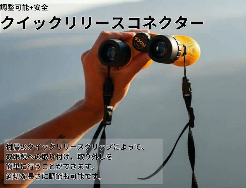 付属のクイックリリースクリップによって、双眼鏡への取り付け、取り外しを簡単に行うことができます。適切な長さに調節も可能です。