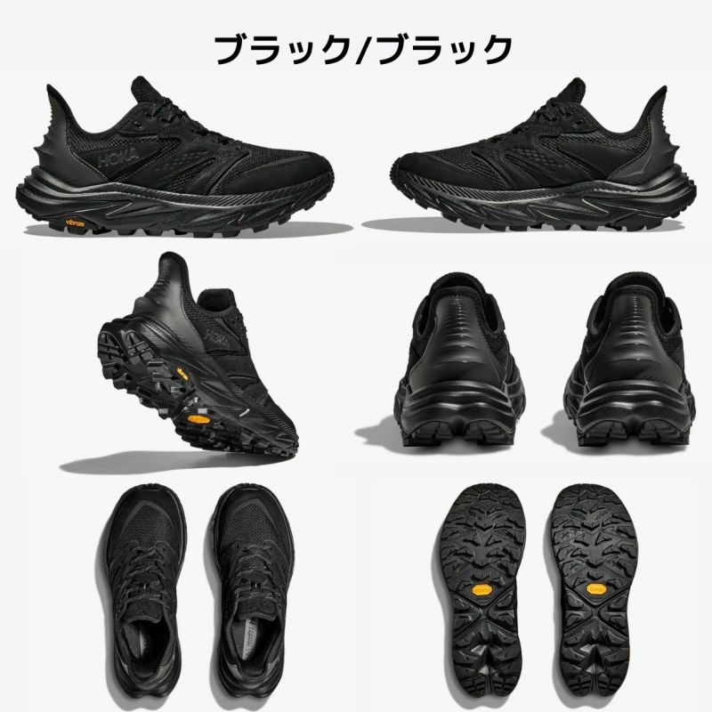 HOKA独自の構造とVibramメガグリップアウトソールを備え、サステナビリティに配慮した55%リサイクルポリエステルメッシュ、大豆ベースのPUソックライナー、30%サトウキビ由来EVAなど素材を使用。