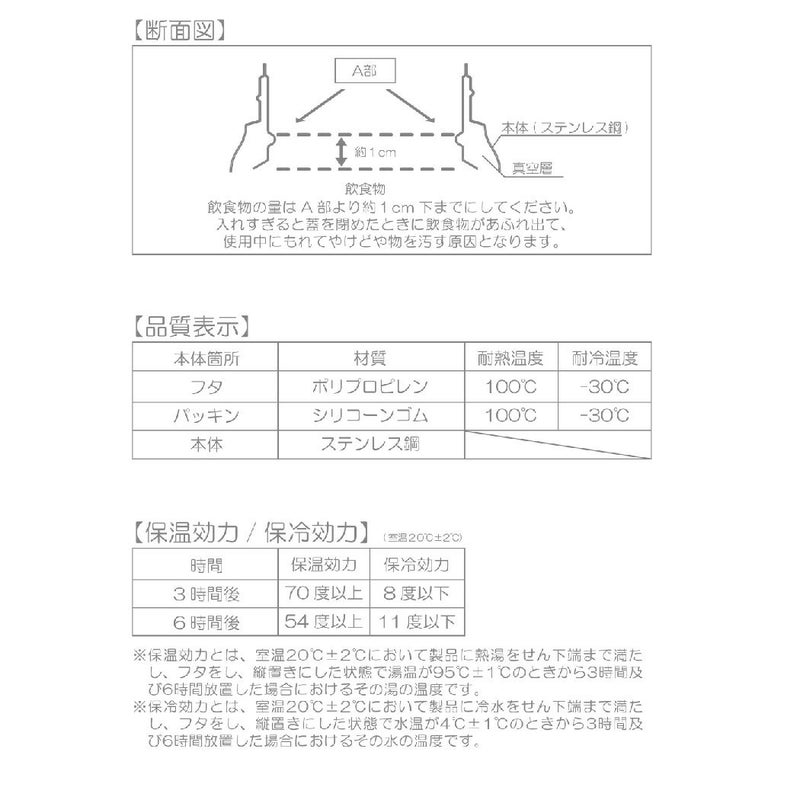 ※保温効力とは、室温20℃±2℃において製品に熱湯をせん下端まで満たし、フタをしたまま縦置きにした状態で湯温が95℃±1℃のときから3時間及び6時間放置した場合におけるその湯の温度。