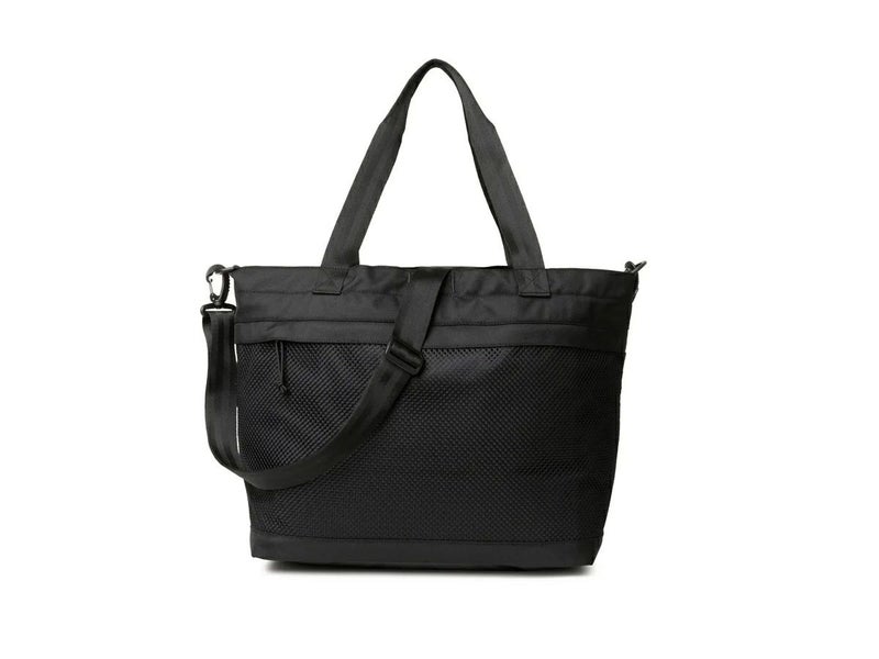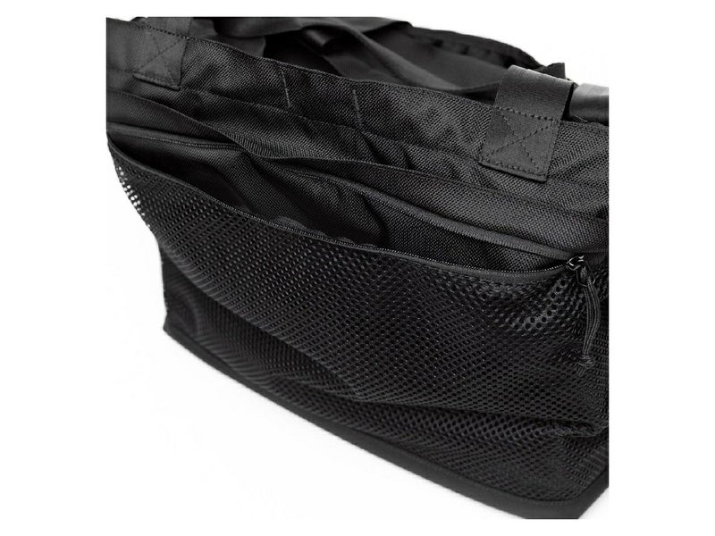 ジムやスポーツ用具を持ち運ぶのに便利な大容量トートバッグ。メイン収納部にはあえて間仕切りを設けず、このバッグを活用するシーンに合わせて使い方をアレンジできるシンプルな仕様になっています。ジムやスポーツ、旅行といった荷物が多くなりがちなシーンはもちろんのこと、底部のパネルにターポリン素材を採用し水の浸入を防ぐ配慮をするなど、頑丈な素材で作られたタフさを活かしアウトドアシーンでも活躍します。ダブルジップ仕様の上蓋も装備されているので、悪天候時にも安心です。
