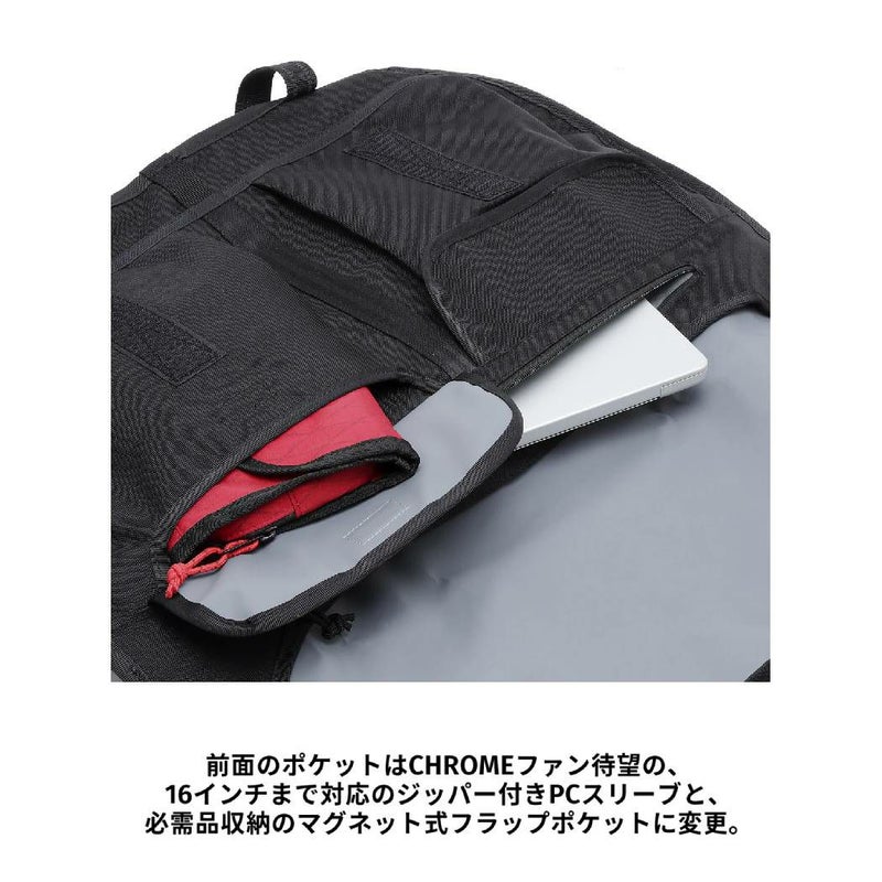 前面のポケットはCHROMEファン待望の、16インチまで対応のジッパー付きPCスリーブと、 必需品収納のマグネット式フラップポケットに変更。 これまたファン待望のキャリーハンドルは、デザインを損なわないようにアップデート。