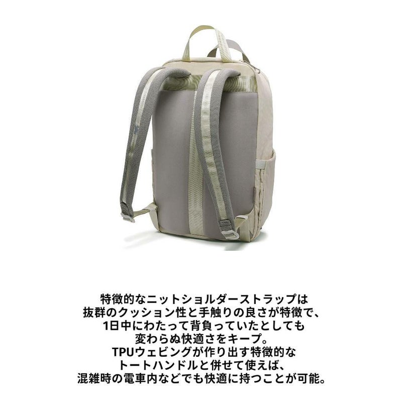 特徴的なニットショルダーストラップは抜群のクッション性と手触りの良さが特徴で、1日中にわたって背負っていたとしても変わらぬ快適さをキープ。