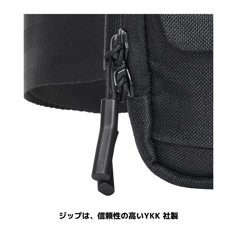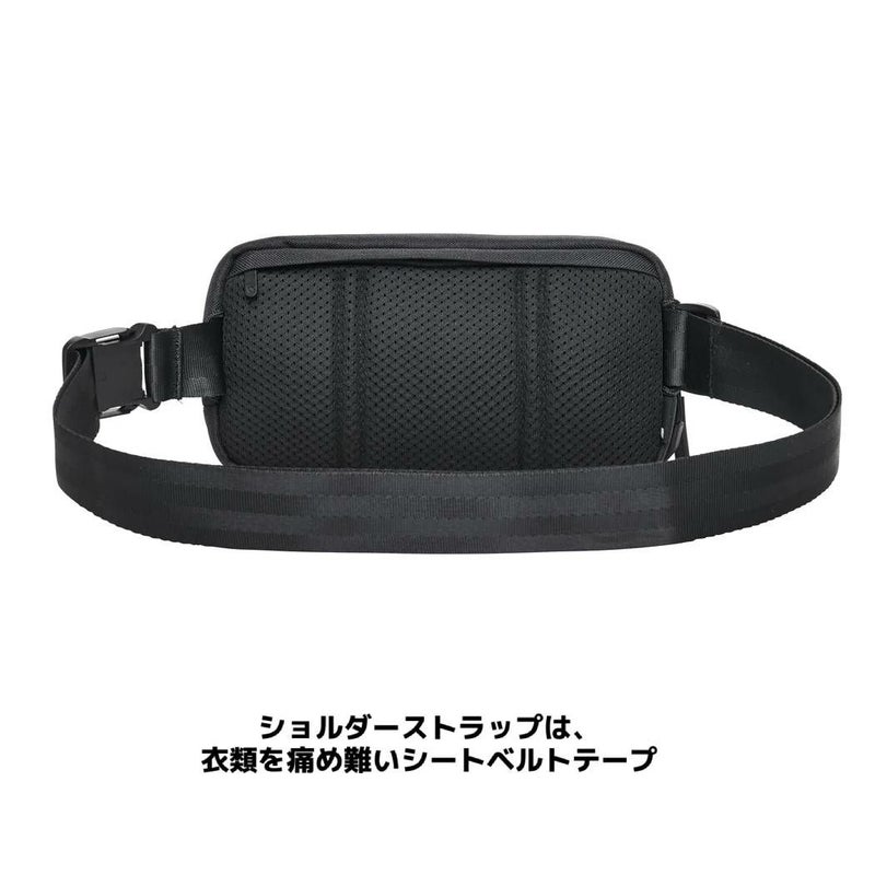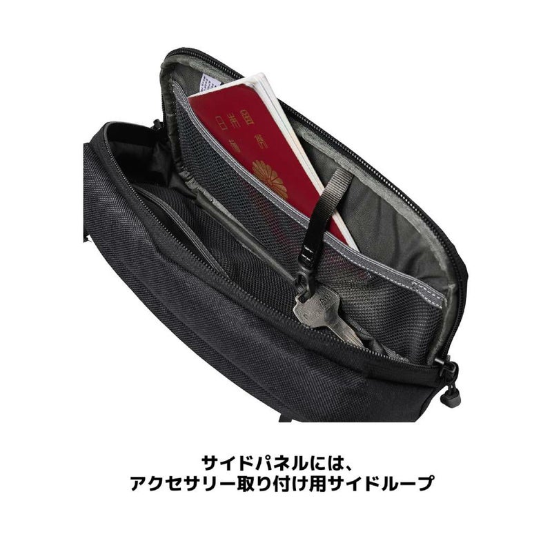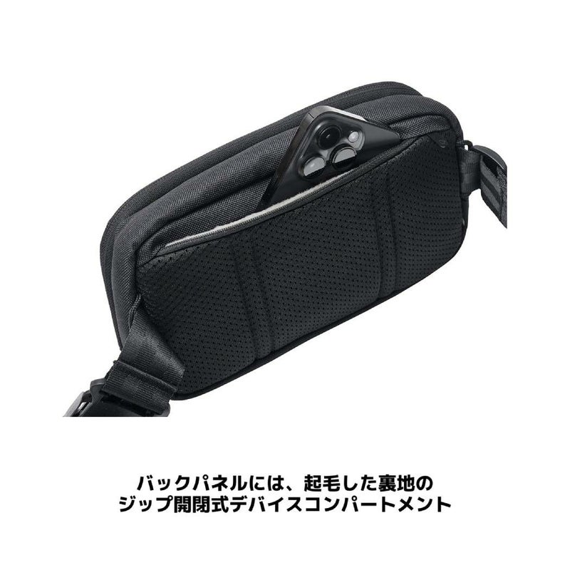 メインコンパートメントは一般的な長財布が入る大きさを要し、荷物を整理しやすくするメッシュポケットやキーフックを設置。バックパネルには、起毛した裏地で作られたモバイルフォンの収納に適したアクセサリーポケットを装備するなど、あらゆるシーンでマッチするデザイン設計が魅力的な逸品。