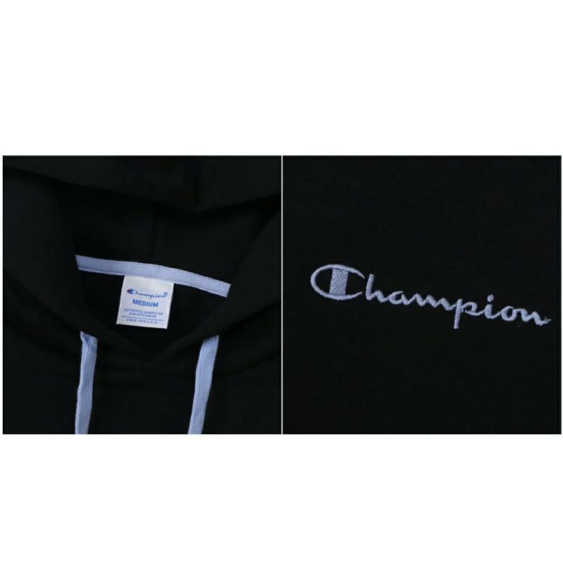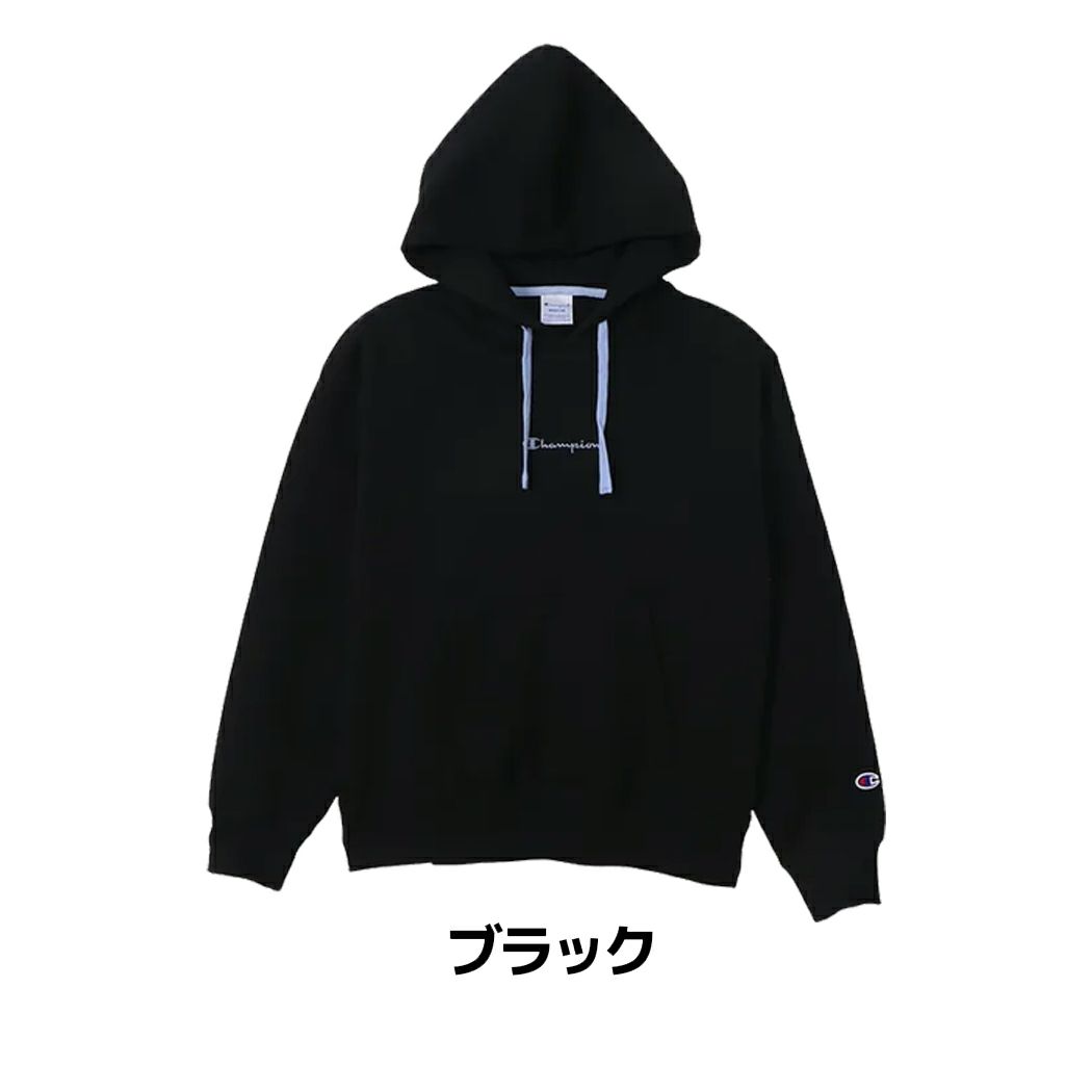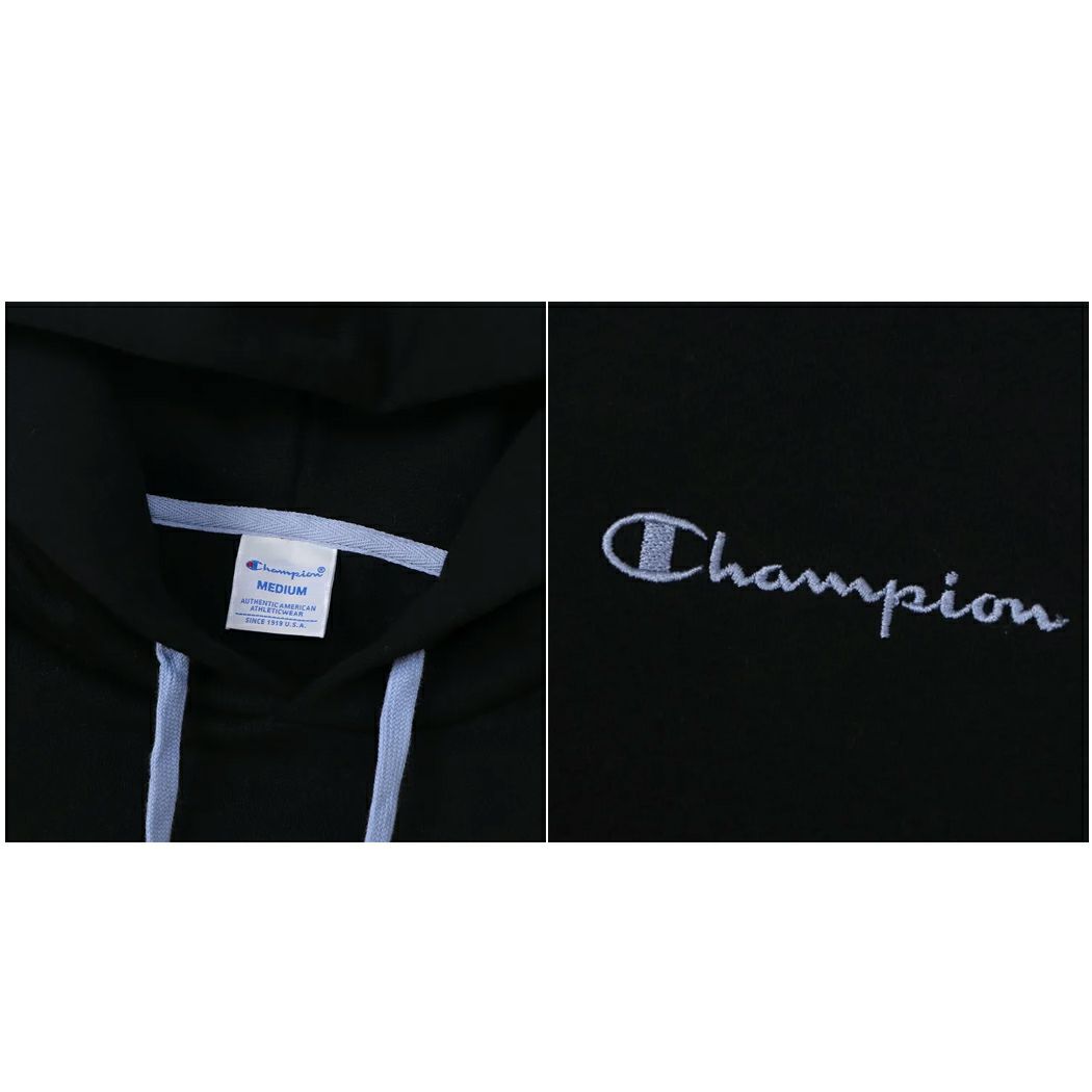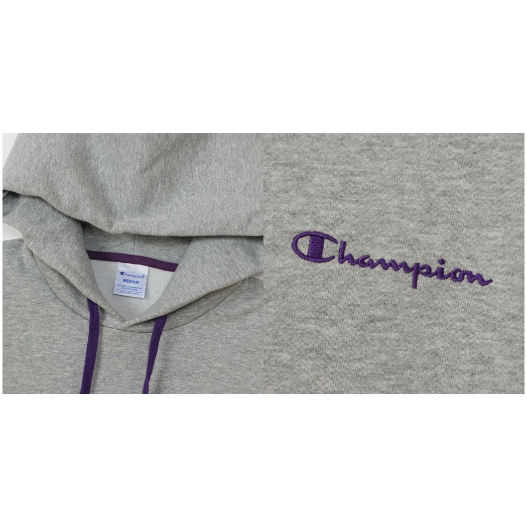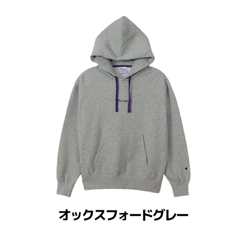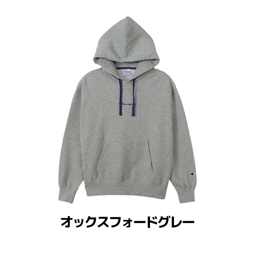 胸にボディカラーと異なる色を使ったChampionロゴ刺繍入り。