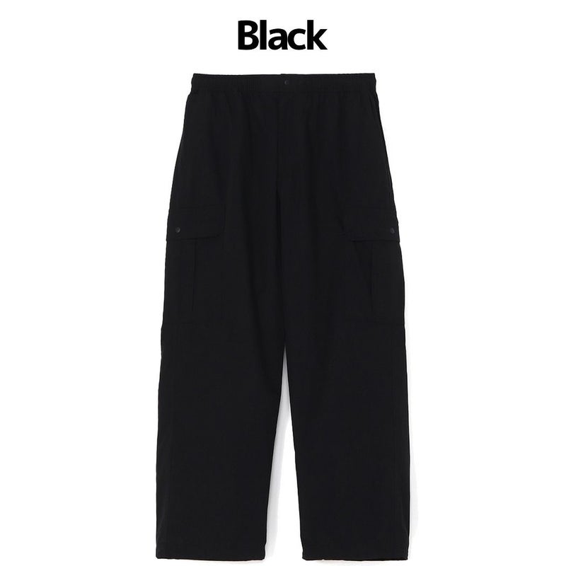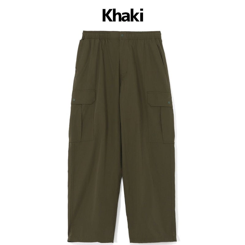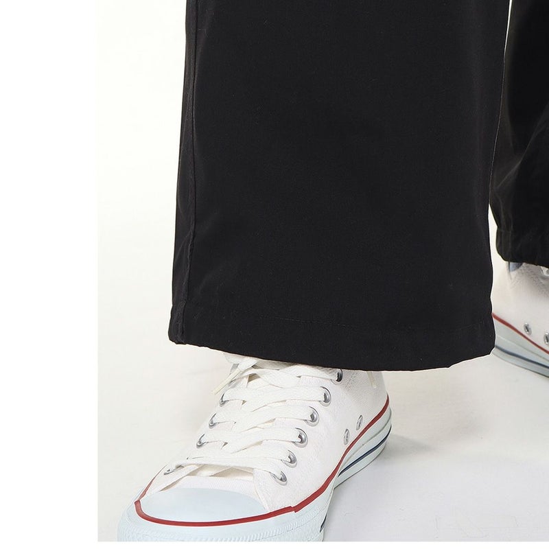 全体的にゆったりとしたワイドシルエットで、裾のコードを絞ることで