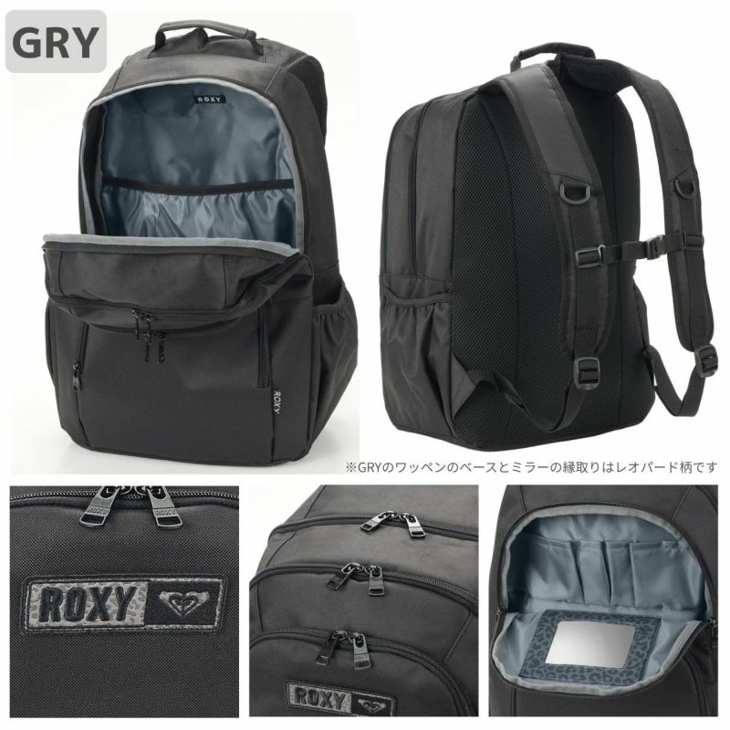 フロントにはロゴとROXYハートのスクエア型ワッペンをあしらい、GRYはワッペンのベースとミラーの縁取りはレオパード柄にしました。