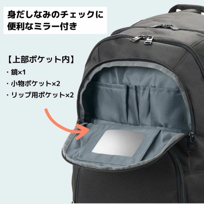 小物を入れて細かく仕分けができるマルチポケットとミラー付きポケットを搭載。