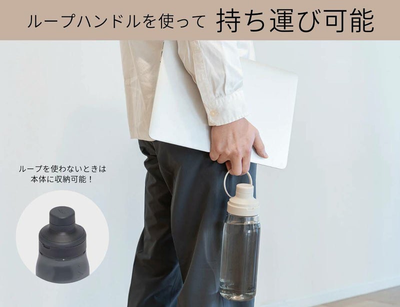 フタに収納されている大きな輪っかを持ち上げれば、ボトルをスマートに持ち運べるハンドルに。手持ち以外にもフックハンガーに掛けたり、カラビナを使ってバッグに取り付けることもできます。ループハンドルはフタにきれいに収まるので、バックパックのサイドポケットにも入れやすいです。