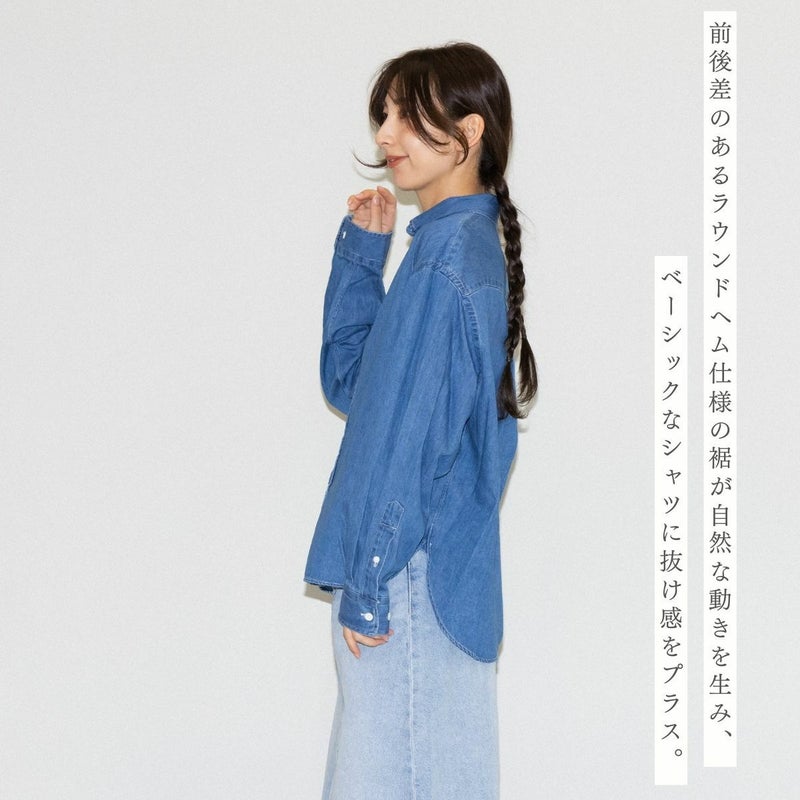 裾はラウンドヘム仕様で、前後差のある着丈が自然な動きを生み、ベーシックなシャツに抜け感をプラス。