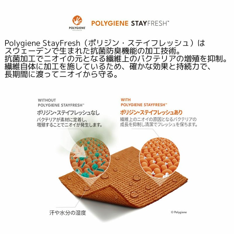 Polygiene StayFresh(ポリジン・ステイフレッシュ)はスウェーデンで生まれた抗菌防臭機能の加工技術。抗菌加工でニオイの元となる繊維上のバクテリアの増殖を抑制。繊維自体に加工を施しているため、確かな効果と持続力で、長期間に渡ってニオイから守る。