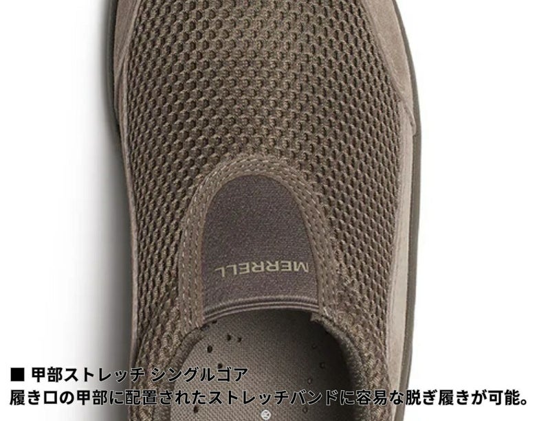 履き口の甲部に配置されたストレッチバンドに容易な脱ぎ履きが可能。
