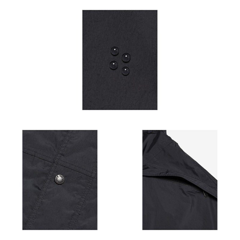 50デニールの薄くしなやかなナイロン素材に、耐久性があり、原料リサイクルが可能なWUROSを採用。加水分解しにくい防水膜とシームテープを使用することで生地の耐久性を強化。フロントはダブルフラップで防水性を高めています。フード付きのミドラーとレイヤリングしやすい立ち襟で、襟にフードが収納可能。裾はドローコードでフィット感の調節ができます。コンパクトに収納でき、携行に便利なスタッフサック付き。