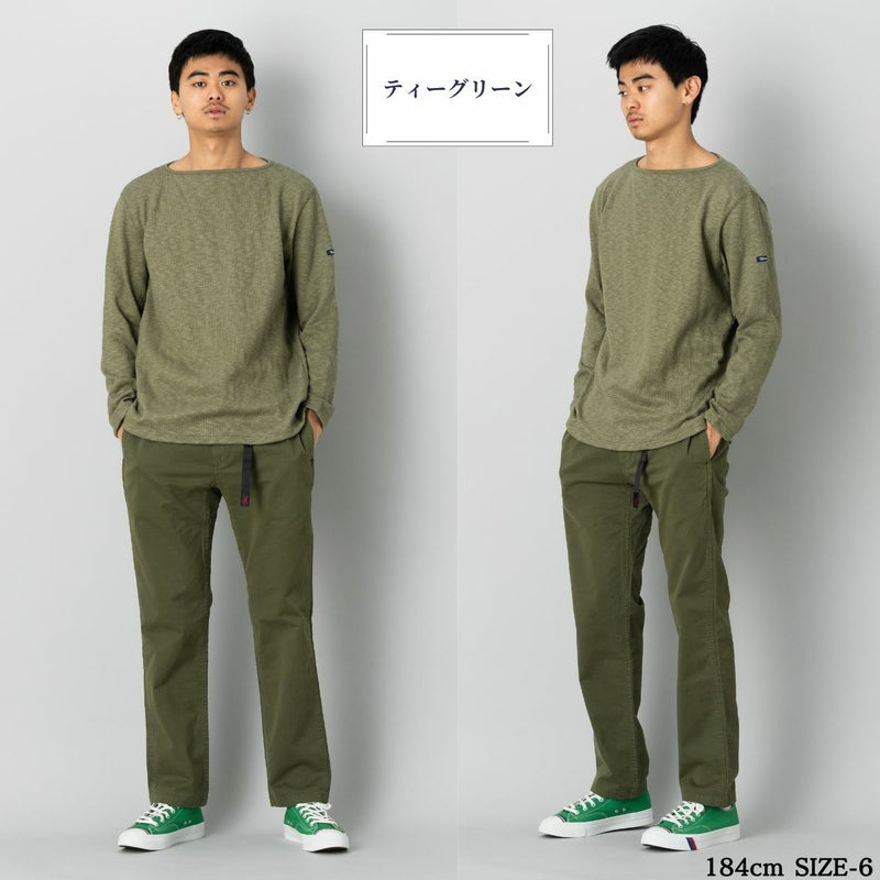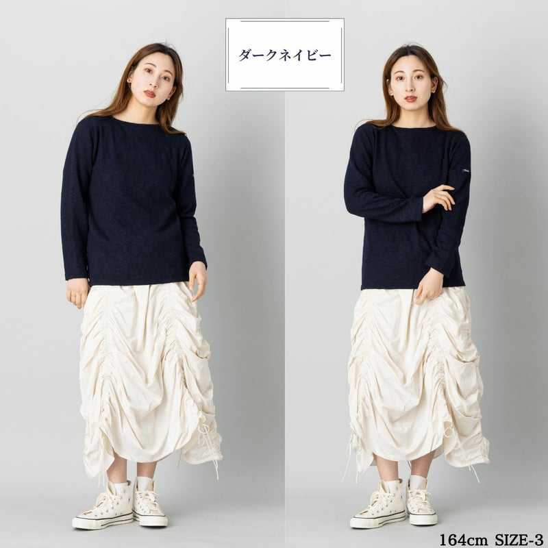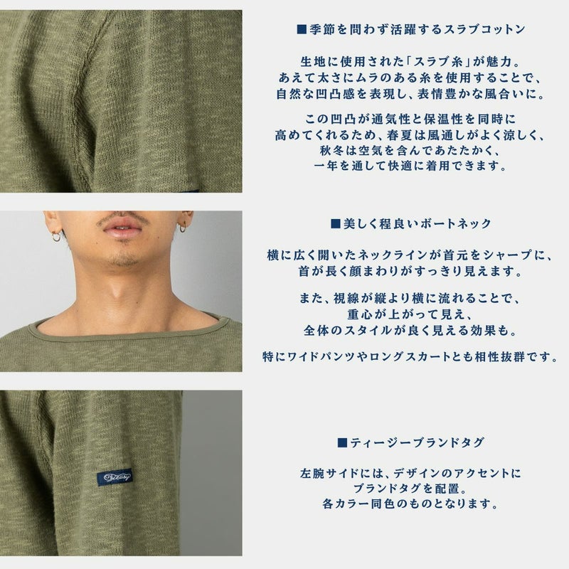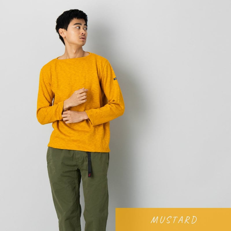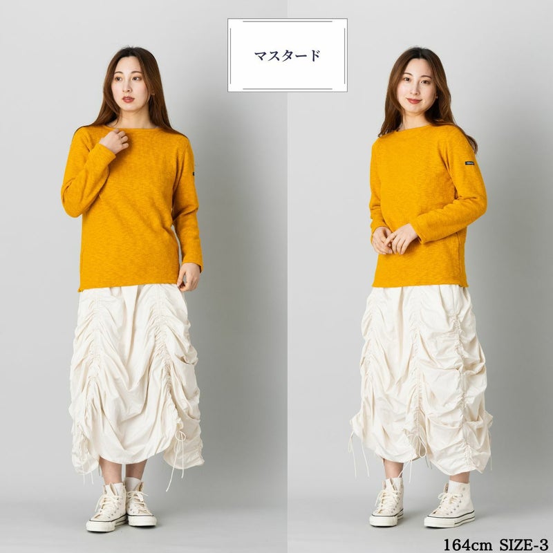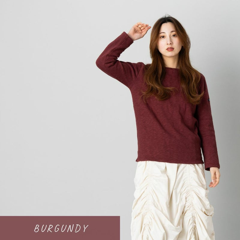 首元はすっきりとしたボートネック仕様で、シャツやカットソーとの重ね着にもぴったり。
