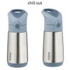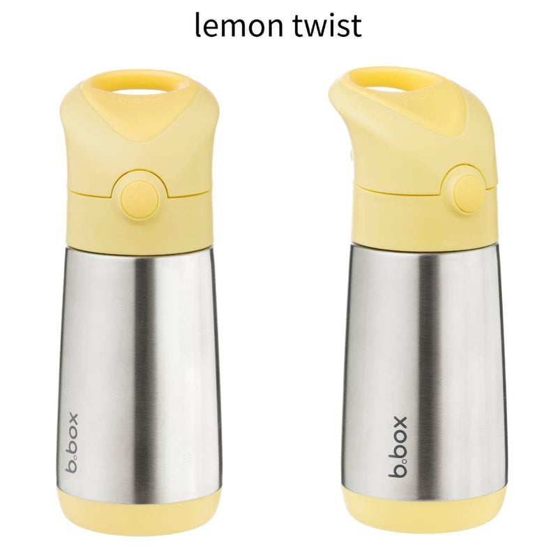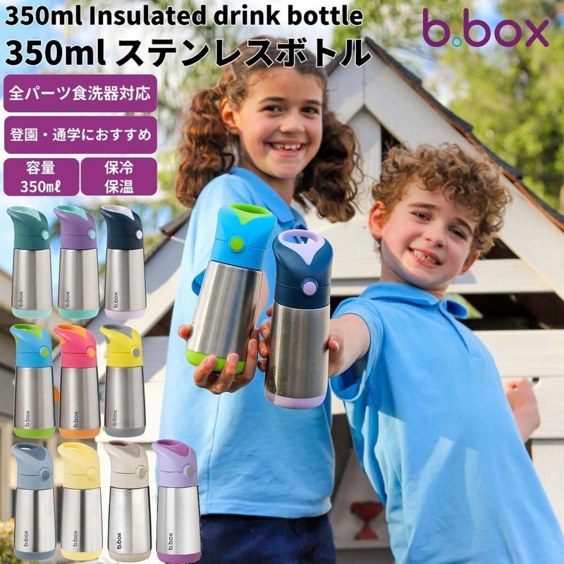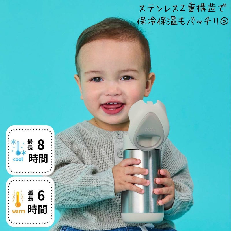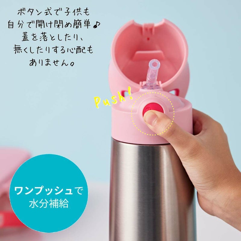 350mlの子供用水筒。3層断熱のステンレス製ボトルで、冷たいものは最長8時間、あたたかいものは最長6時間、温度を保ちます。お出かけにも便利な保冷保温が可能なドリンクボトルです。持ち運びに便利なキャリーハンドルと、ワンプッシュで開くボタン式の蓋が特徴です。