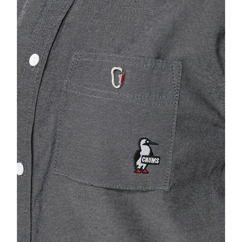 胸ポケットはカラビナ釦とバッジロゴモチーフのポケット袋でCHUMSらしさを表現。