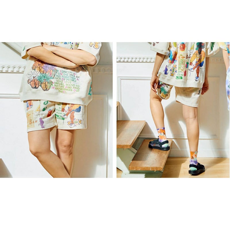 カンガルーポケット付きのラグランTシャツとショートパンツの展開でセットアップ対応。