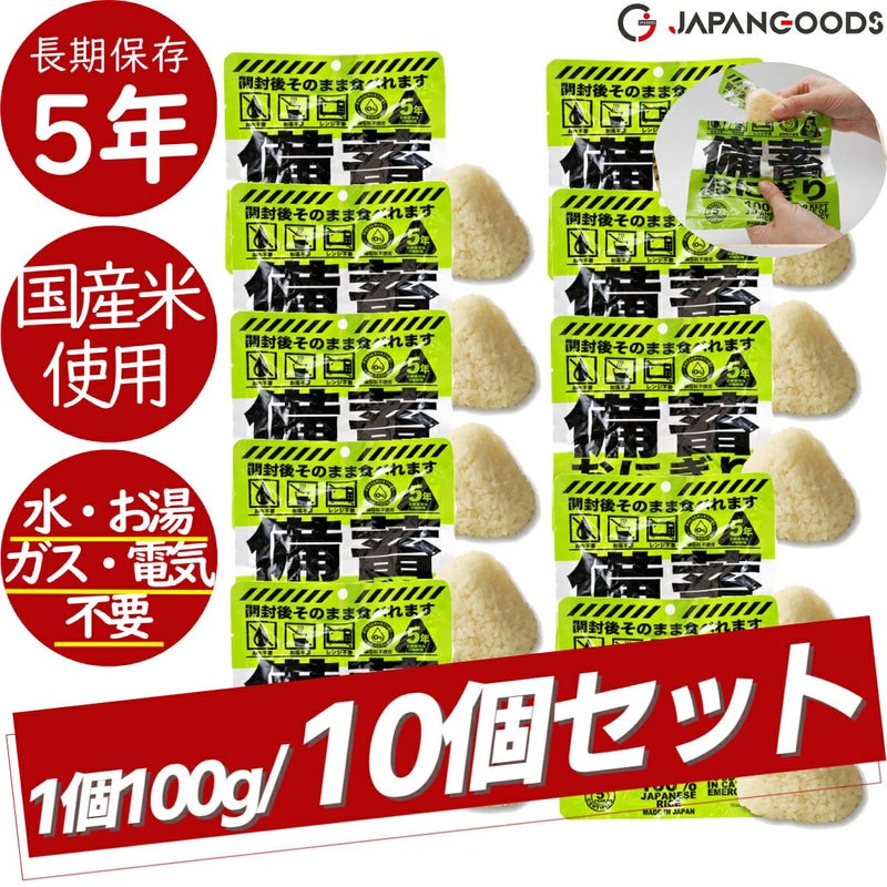 登山 アウトドア トレイル 小物 【10個セット!】ジャパングッズ JAPANGOODS 備蓄おにぎり 10個セット おむすび おにぎり 国産 日本製 国産米 5年間長期保存 水不要 お湯不要 電気不要 ガス不要 米 環境に優しい 災害 震災 遭難 レスキュー 非常食 保存食 防災食 防災アイテム 備蓄 キャンプ アウトドア
