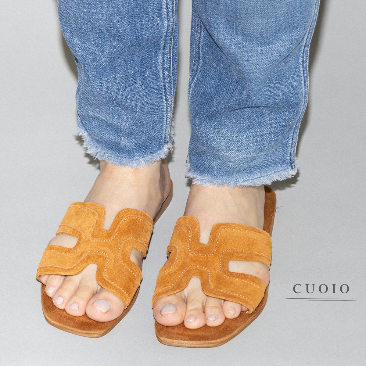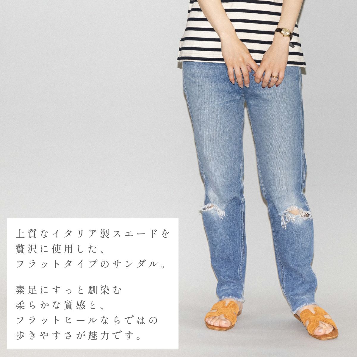 上質なイタリア製スエードを贅沢に使用した、フラットタイプのサンダル。