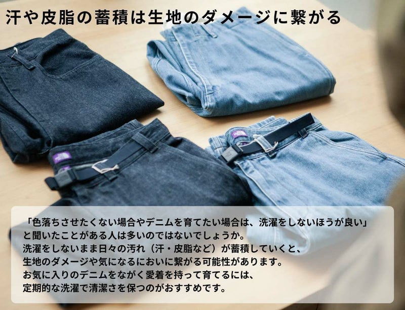 洗濯をしないまま日々の汚れ(汗・皮脂など)が蓄積していくと、生地のダメージや気になるにおいに繋がる可能性があります。お気に入りのデニムをながく愛着を持って育てるには、定期的な洗濯で清潔さを保つのがおすすめです。