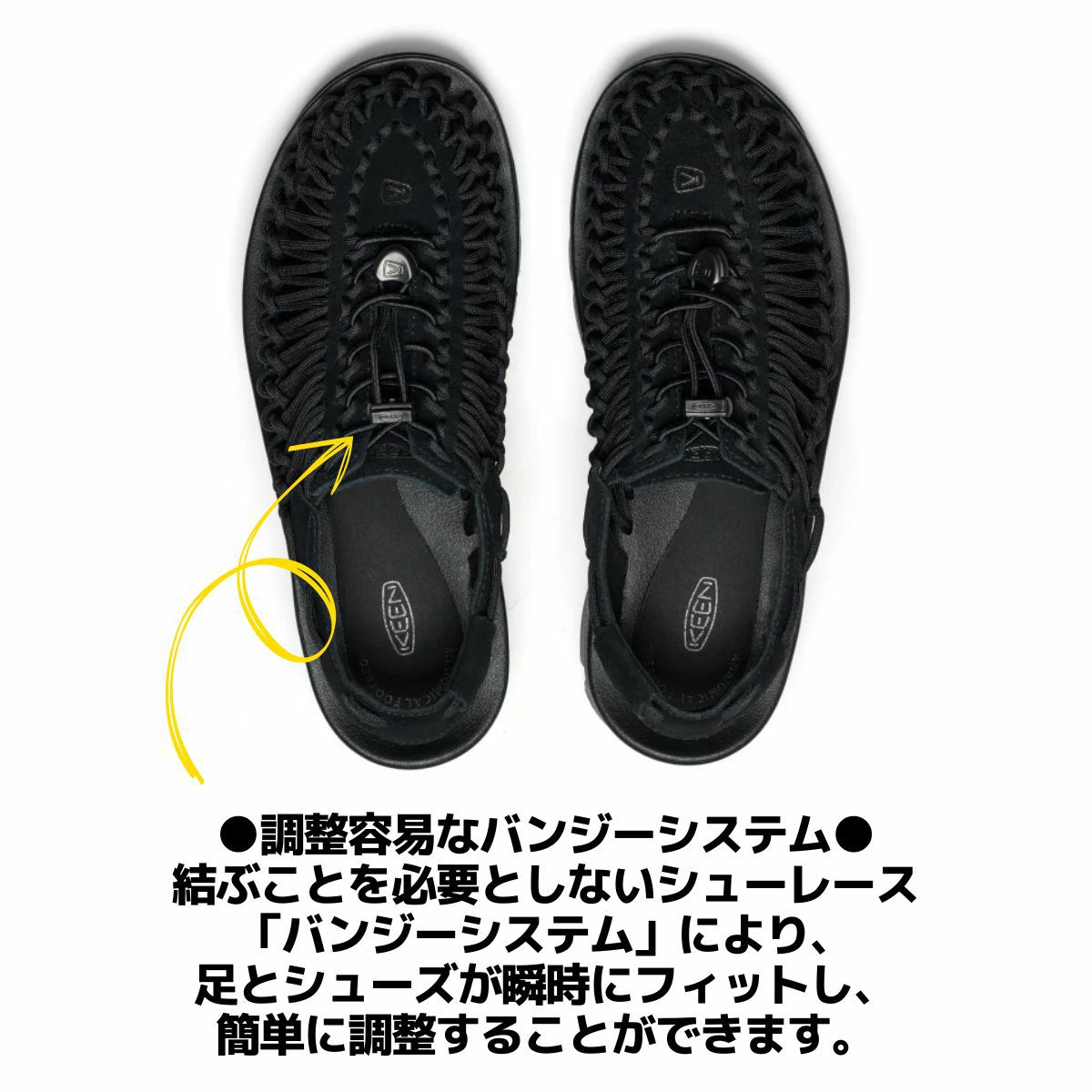 結ぶことを必要としないシューレース「バンジーシステム」により、