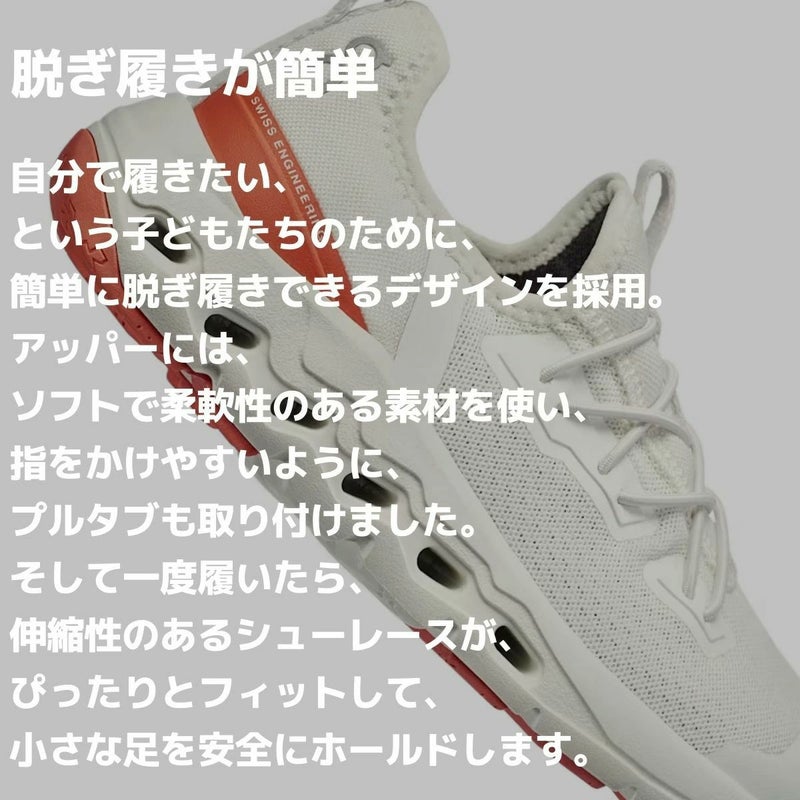 簡単に脱ぎ履きできて、一日中快適に遊べるキッズシューズ。