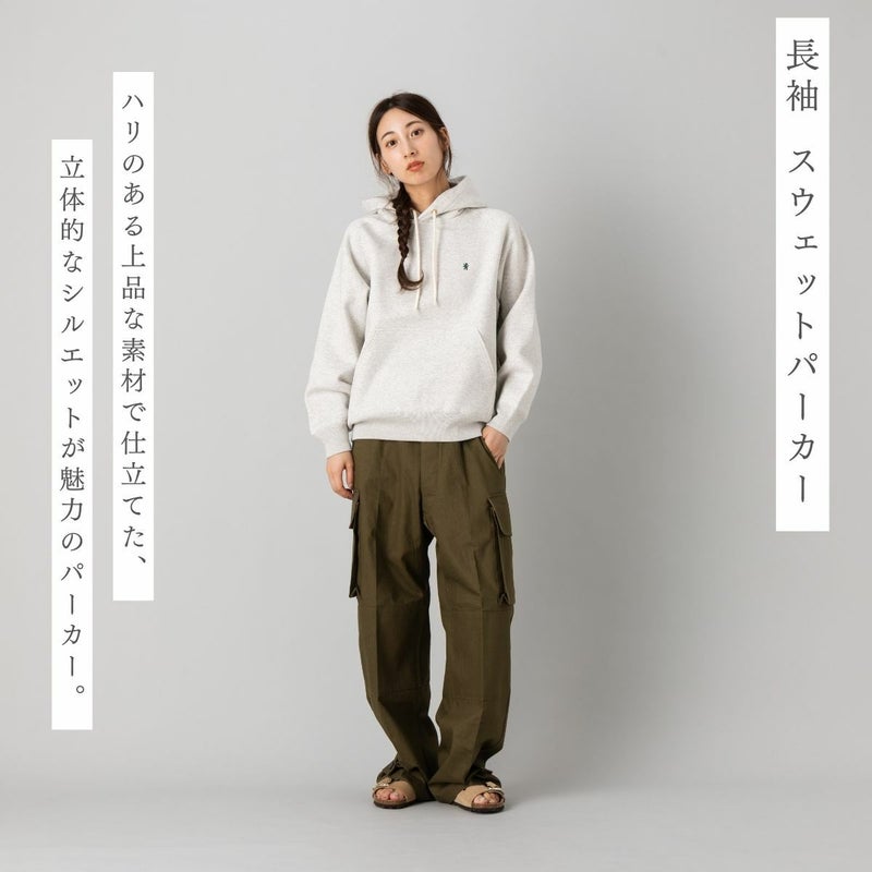 ハリのある上品な素材で作られる立体的なシルエットが特徴のパーカー。